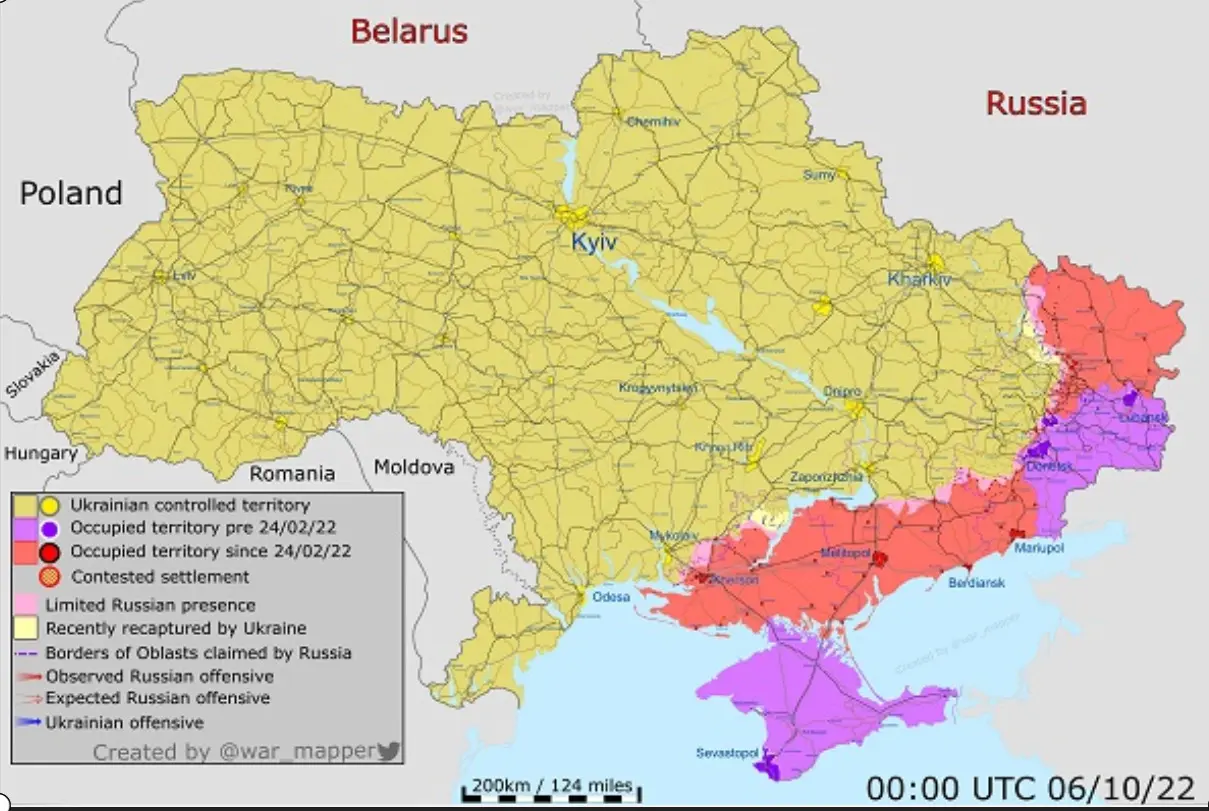 Воената мапа на Украина на полноќ, 6 октомври, покажува понатамошно напредување на воените сили на Украина. Според извештаите од боиштата, украинските сили напредуват на северо-истокот и на југот на фронтот, овозможувајки понатамошни напади врз руските рути за снабдување во правецот на градот Сватове.