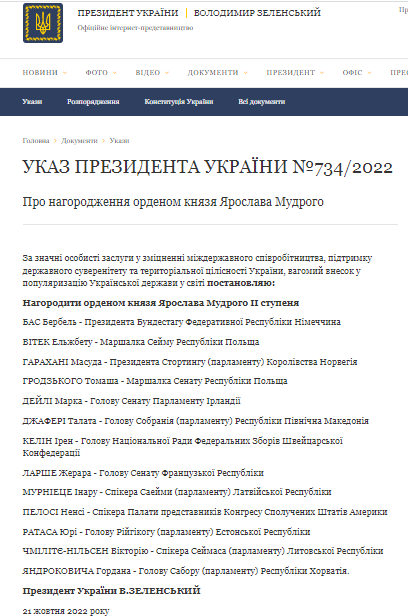 Списокот со имињата на кои Зеленски им додели Орден „Јарослав Мудриот“ може да се прочита на службената страница на украинското претседателство.