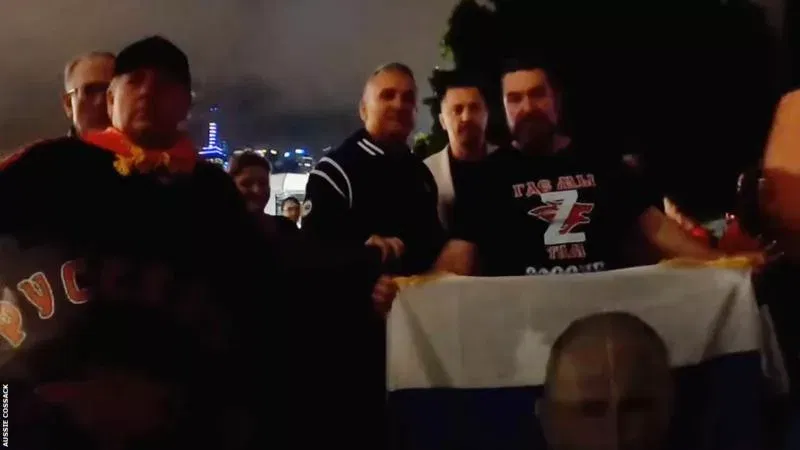 Група навивачи облечени во боите на Србија пред арената Род Лејвер изразија поддршка за Русија истакнувајќи руско знаме со ликот на Владимир Путин, пренесува Би-Би-Си.