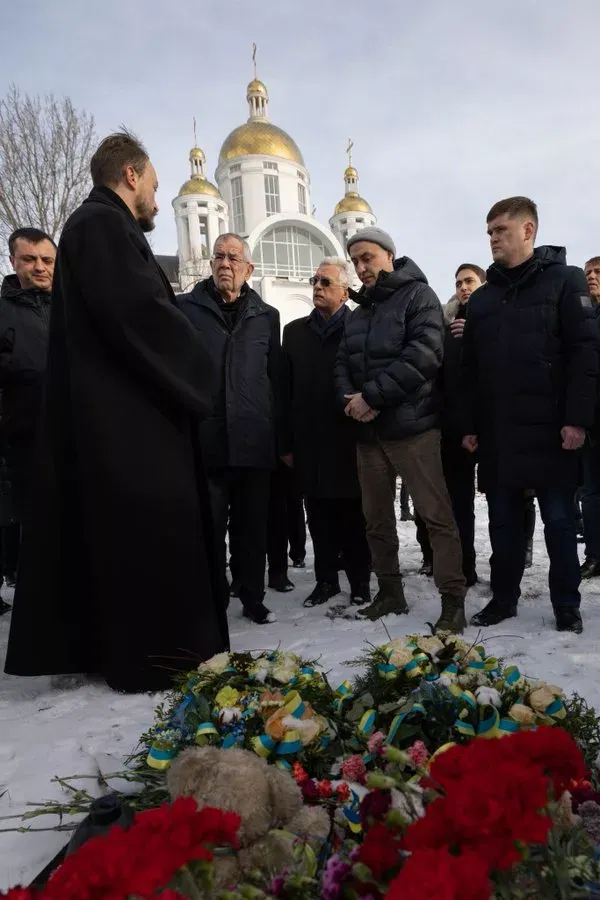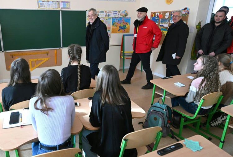 Според АПА, австриската делегација предводена од претседателот пристигна во Украина со конкретна помош, носејќи особено генератори на струја, како и материјали за изградба на 200 куќи обезбедени од „Wienerberger Group“.