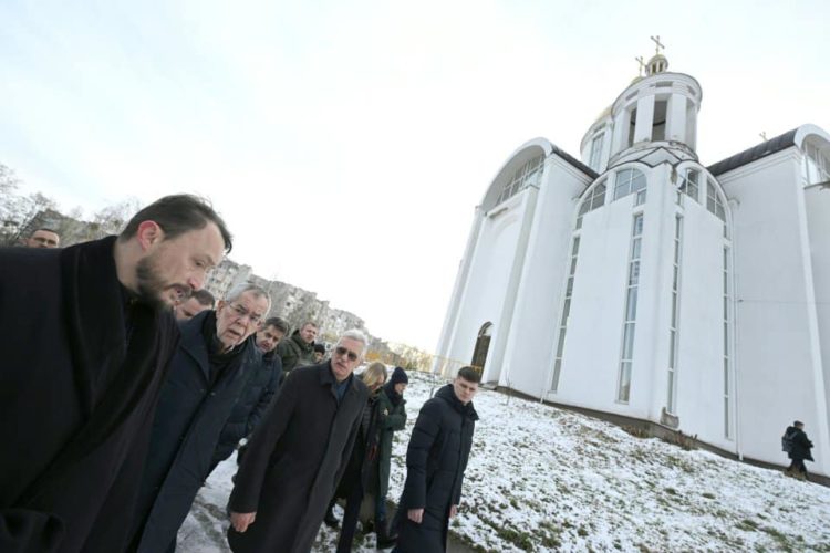 Според АПА, австрискиот претседател ја започнал својата посета на Украина со патување во Буча, каде што го посетил местото на масовната гробница на Украинците, кои беа мачени и убиени во предградието на Кијив, во близина на црквата „Св. Првоповиканиот апостол Андреј“. Ван дер Белен таму разговарал и со локалниот свештеник, кој му раскажувал за злосторствата извршени од руската војска во Буча.