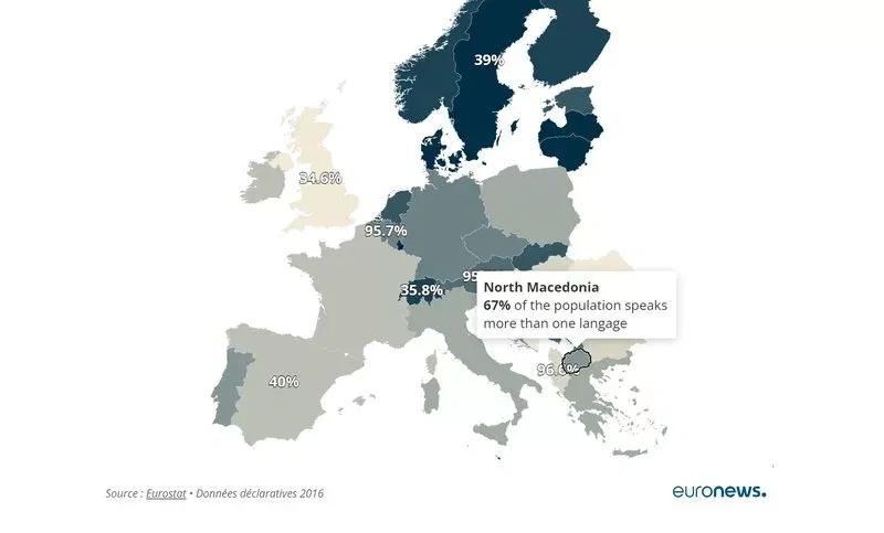 Во Македонија 67 отсто од полнолетните граѓани зборуваат повеќе од еден јазик. Во земјите од регионот, предничи Албанија со 96,6 проценти, а најмал е процентот на граѓаните од Словенија, само 42,4 проценти. Во Грција тој процент е 86,3, во Србија 50,9, Бугарија 94,5, Хрватска 92,1, во Босна и Херцеговина е 95,6 проценти. За Црна Гора и Косово, нема податоци.