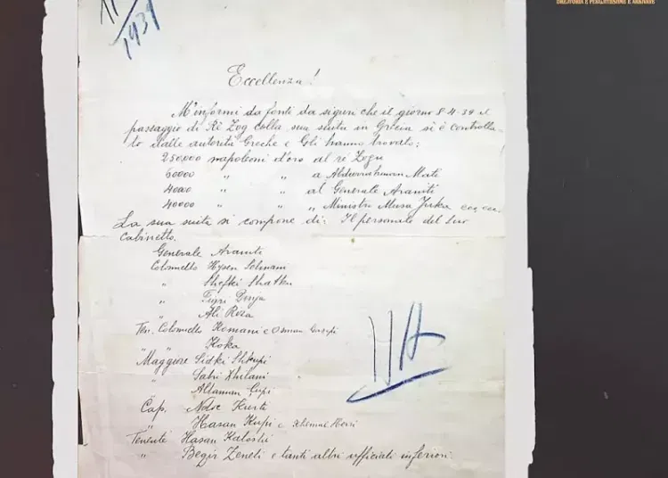 – Според Архивот, овој нов историски факт се очекува да побуди многу дебати, бидејќи документот е извлечен од фондот на фашистичката милиција и доаѓа во форма на извештај. Во документот потпишан од Ѓон Луша стои дека на 8 април 1939 година кралот Зогу ја преминал границата со Грција со 250.000 златни наполеони, со 60.000 Абдурахман Мати и по 40.000 златни наполеони носеле генерал Арамити и министерот Муса Јука, пренесуваат албанските медиуми