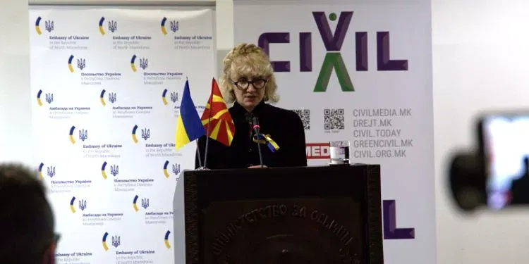 Амбасадорката на Украина, Н.Е. Лариса Дир, на почетокот од своето обраќање на  Конференцијата „Украина – година на хероизмот“ се заблагодари за поддршката на Украина, како и на присутните за тоа што најдоа време да се придружат на оваа конференција, која е посветена на херојската година на отпорот на Украинците, организирана со помош на ЦИВИЛ.