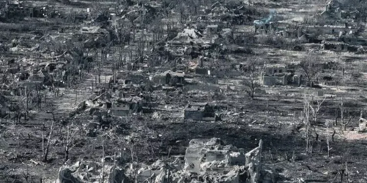 Ukrainian Marinka in the Donetsk region. It used to be home for around 10,000 people. It used to be a peaceful city. It used to be… until Russia’s war criminals razed it to the ground. Zoom in to see that nothing is left untouched.