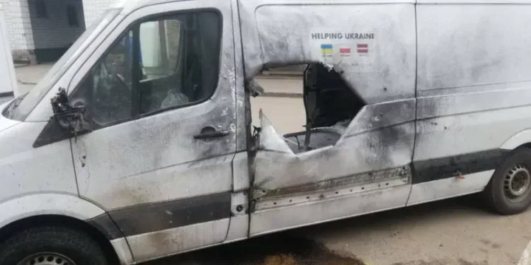 – Русите тероризираат и убиваат цивили, вклучително и волонтери. На фотографијата има гранатиран волонтерски автобус, напиша на Твитер амбасадорката на Украина во земјава, Лариса Дир.