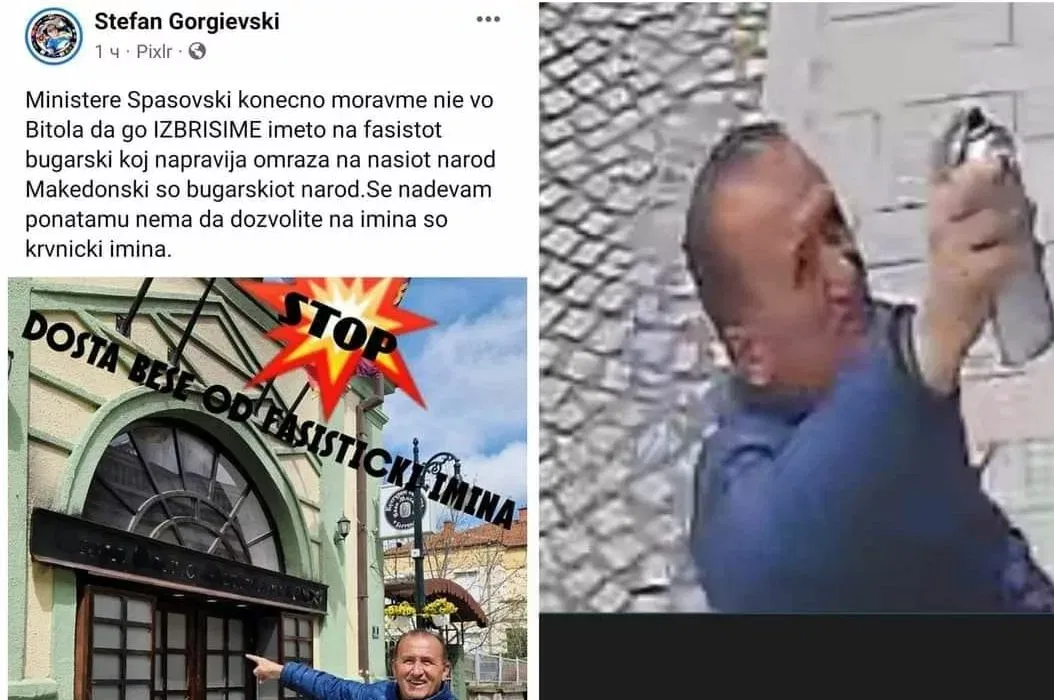 Ова на социјалната мрежа Фејсбук го објави Стефан Горгиевски, кој на социјалната мрежа се пофали со фотографија дека вчера околу 11 часот со црн спреј го покрил името.