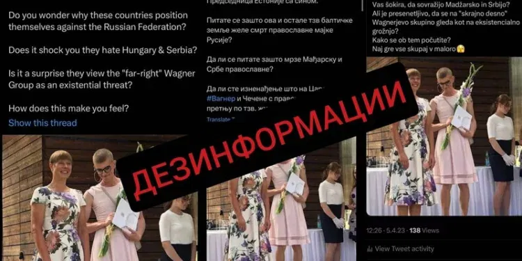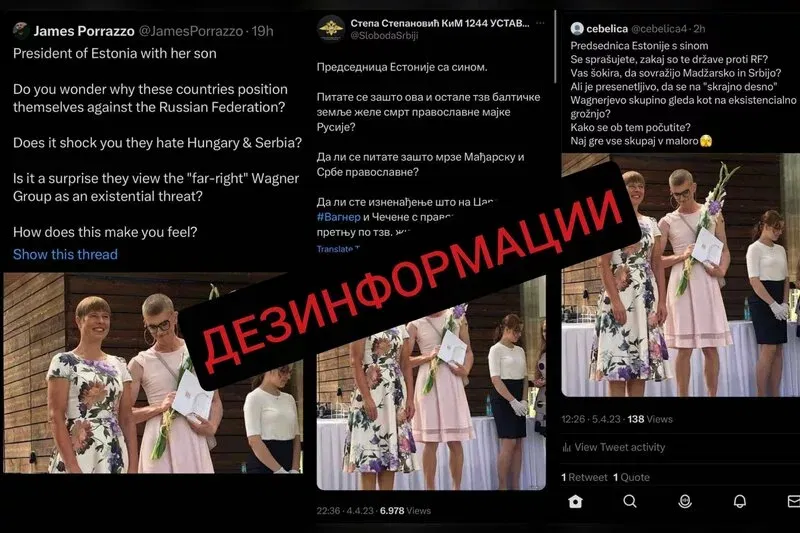 Твитовите, иако на различни јазици и за различни публики, ја споделуваат истата дезинформација: дека на фотографијата ја гледаме претседателката на Естонија заедно со нејзиниот син облечен во розов фустан. Па, таа информација веднаш (и малку нелогично) се поврзува со некаква омраза за православието (ама и Унгарците!)…
