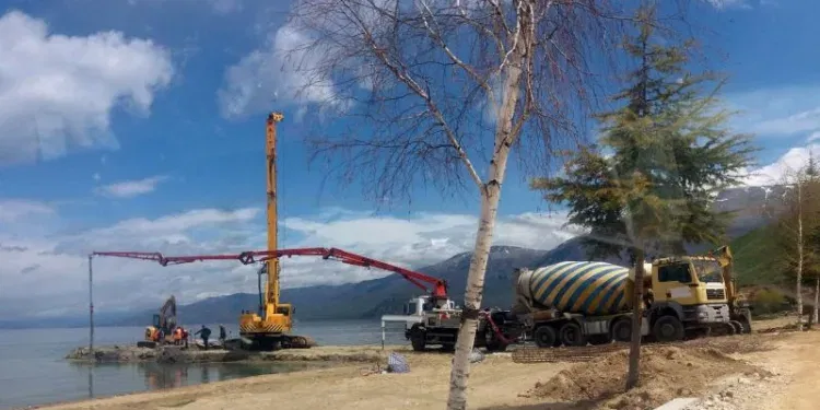 Декларираните заложби за заштита на Охридското Езеро повторно на тест. На самото крајбрежје на езерото на албанската страна кај селото Тушемиште се изведуваат градежни активности со истурање бетон во водата.