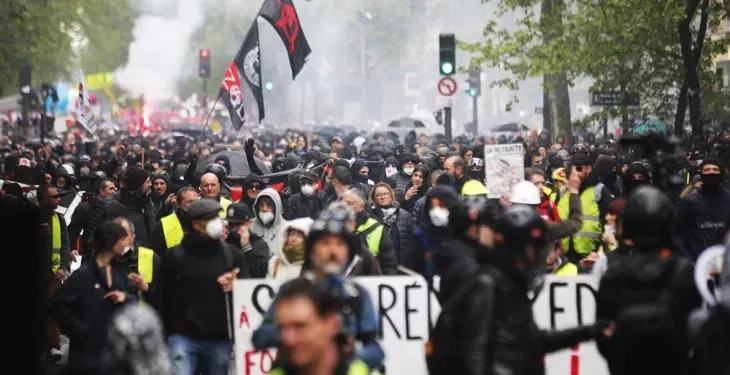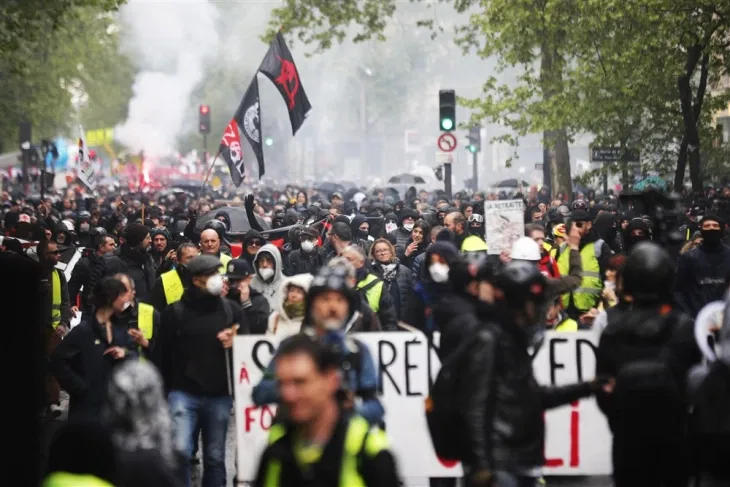 Во понеделникот, неколку стотици илјади луѓе ширум Франција учествуваа на првомајските поворки, кои беа обележани со протести на обединетите синдикати против пензиските реформи. Генералниот секретар на синдикатот ЦГТ Софи Бине рече дека е многу задоволна од „големиот одѕив што ја покажува решителноста да се постигне повлекување на пензиската реформа“, а нејзиниот колега од ЦФДТ Лоран Бергер ја пофали „големата мобилизација“ на 1 мај.