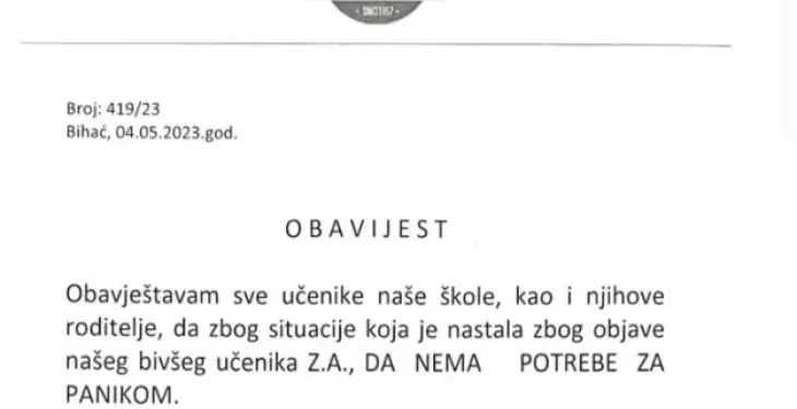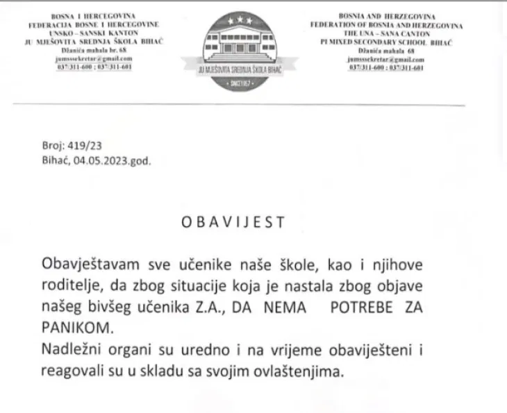 „Ги известуваме сите ученици од нашето училиште, како и нивните родители, дека поради ситуацијата настаната поради објавата на нашиот поранешен ученик З.А., нема потреба од паника. Надлежните органи беа соодветно и навреме информирани и реагираа согласно нивните овластувања“, се наведува во соопштението.