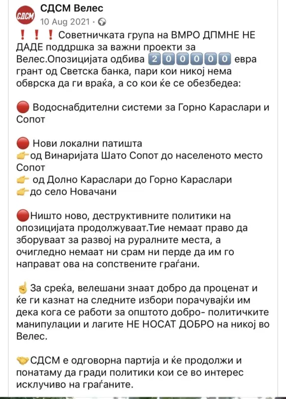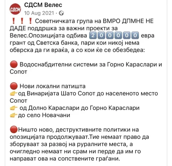 Во објава на Фејсбук од август 2021 година, ОО СДСМ Велес реагирале на недавањето поддршка на советниците од ВМРО-ДПМНЕ за водоводот во Сопот.