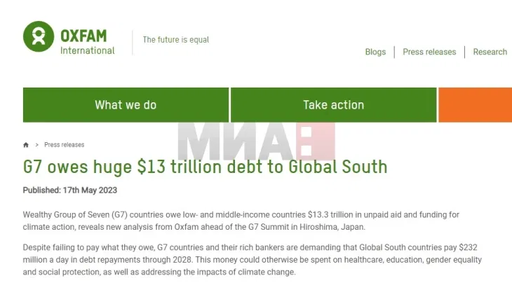Богатите и индустријализираните земји од Г7 им должат на сиромашните земји околу 13 трилиони долари неплатена помош за развој, како и поддршка во борбата против климатските промени, процени хуманитарната организација Оксфам.