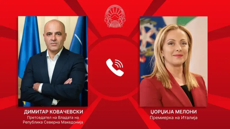 Премиерот Димитар Ковачевски, во телефонски разговор со премиерката на Италија, Џорџија Мелони, разговараше за повеќе актулени прашања за нашата држава и за регионот, информираат од Владата.