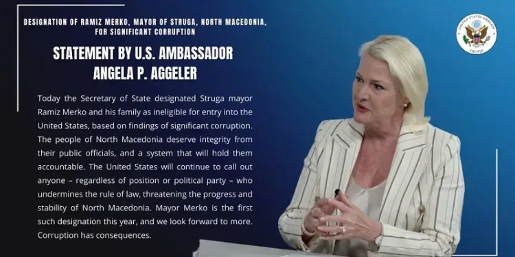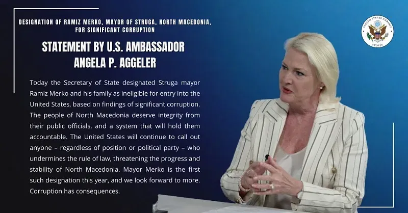 Американската амбасадорка Анџела Агелер, во врска со прогласувањето за непожелна личност за САД на струшкиот градоначалник Рамиз Мерко од страна на Стејт департментот, поради корупција, вели дека „народот на Северна Македонија заслужува интегритет од своите јавни функционери и систем којшто ќе ги смета за одговорни“.