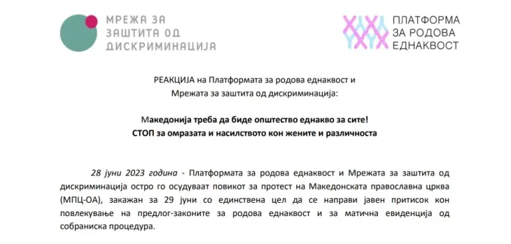 Платформата за родова еднаквост и Мрежата за заштита од дискриминација остро го осудуваат повикот за протест на Македонската православна црква (МПЦ-ОА), закажан за 29 јуни со единствена цел да се направи јавен притисок кон повлекување на предлог-законите за родова еднаквост и за матична евиденција од собраниска процедура.