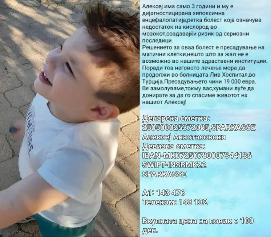 На тригодишниот Алексеј од Скопје кој е предвремено родено бебе, дијагностицирана му е ретка болест, хипоксична енцефалопатија. Болест која се каракетризира со недостаток на кислород во мозокот и создава ризик од сериозни оштетувања.