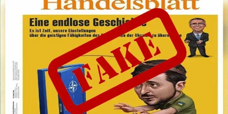 Каналите на Z-Телеграм и ботови на Твитер споделуваат лажна насловната страна на германскиот деловен дневен весник Handelsblatt, на која е прикажана карикатура на претседателот на Украина Володимир Зеленски кому не му е дозволено да влезе во НАТО.