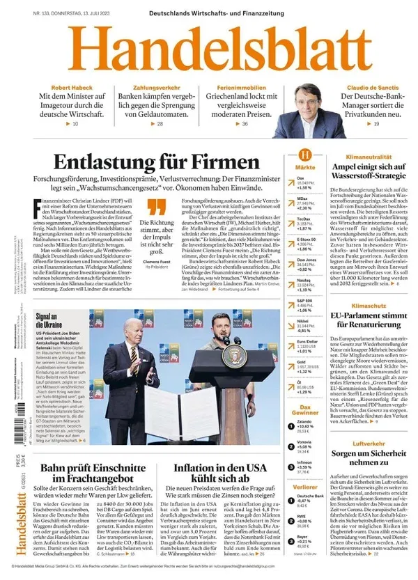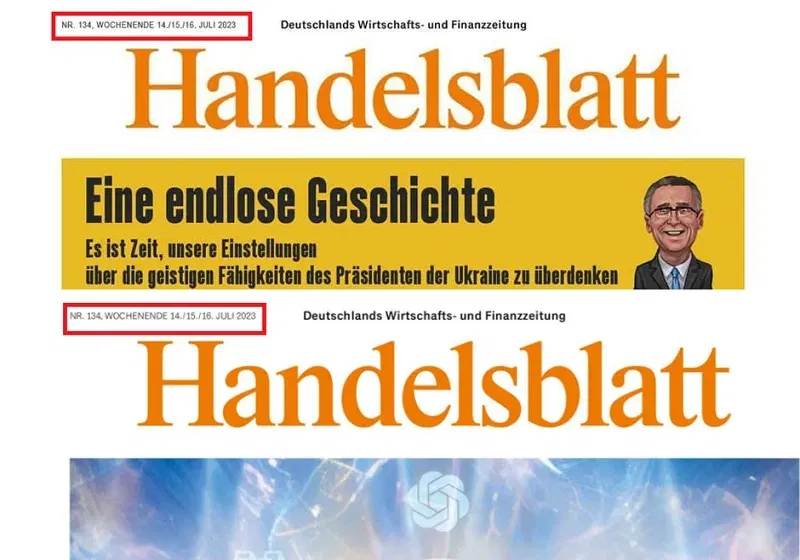 Ова е лажна конструкција на руска пропаганда. На официјалната веб-страница на Handelsblatt нема корица со оваа слика. На лажната корица пишува дека изданието има број 134 и ќе излезе на 14 јули 2023 година. Но, изданието на тој број и објавеното на тој датум имаше сосема поинаква корица.