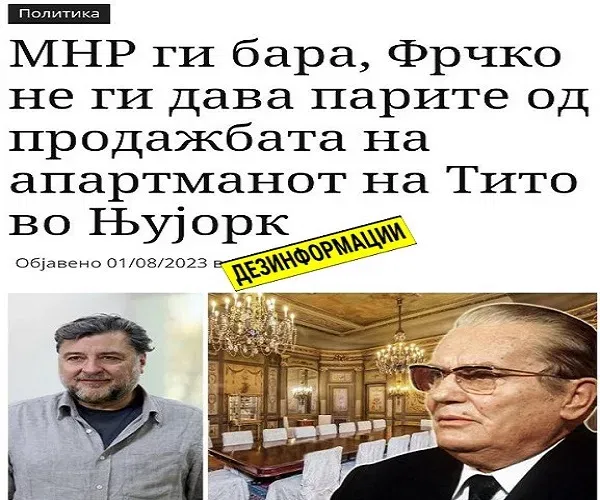 Министерството за надворешни работи (МНР) реагира на, како што велат, паушалните и без основа обвинувања на ВМРО-ДПМНЕ, последни од серијата манипулации создадени во фабриката за лаги на ВМРО-ДПМНЕ чија работа сѐ повеќе се засилува, во врска со тврдењата на Наум Стоилковски, портпаролот на ВМРО-ДПМНЕ за тоа дека наводно амбасадорот Љубомир Фрчкоски и покрај неколкуте инструкции од МНР, не ги префрла парите од продажбата на апартманот на Тито на Парк авенија во Њујорк, и ги држи на сметката од мисијата.