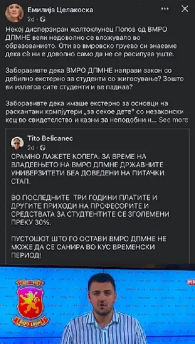 „Срамно лажете колега. За време на владеењето на ВМРО-ДПМНЕ државните универзитети беа доведени на питачки стап. Во последните три години платите и другите приходи на професорите и средствата за студентите се зголемени преку 30%. Пустошот што го остави ВМРО-ДПМНЕ не може да се санира во кус временски период“, објави Тито Беличанец на својот фејсбук профил.