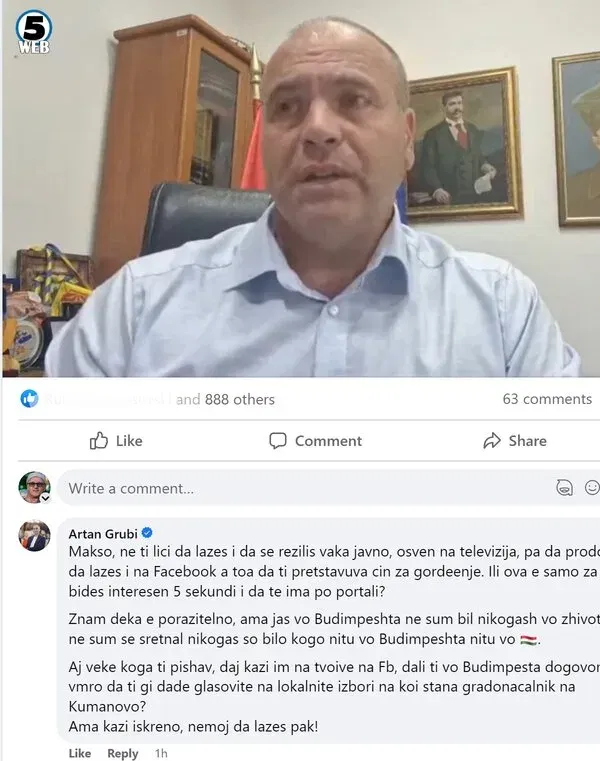 Артан Груби во коментар на Фејсбук профилот на Максим Димитриевски, го прашува кумановскиот градоначалник, дали тој во Будимпешта договорил ВМРО-ДПМНЕ да му ги даде гласовите на локалните избори со кои стана градоначалник на Куманово.