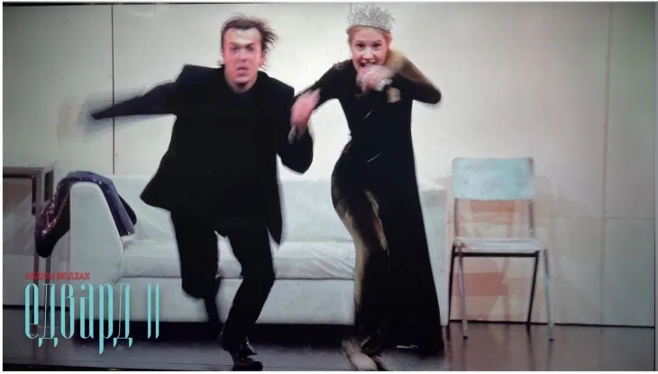 Во претставата главниот лик Едвард Втори е поделен на две улоги кои истовремено ги реализираа двајца актери, Илин Јованоски и Бугаринот Борис Крстев. Во главната женска улога пак, настапи Јована Миладинова.
