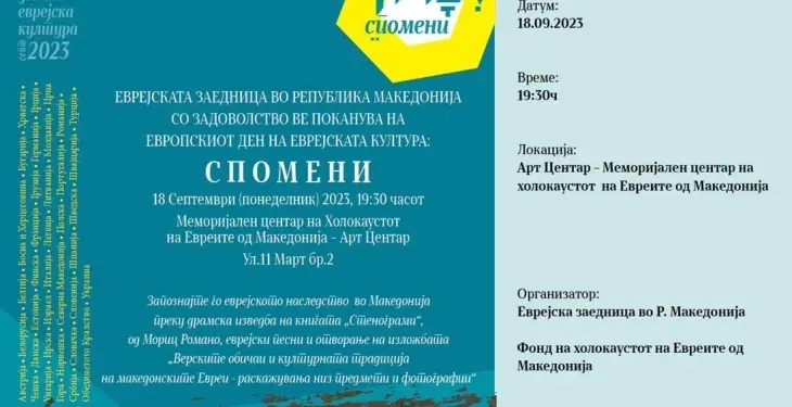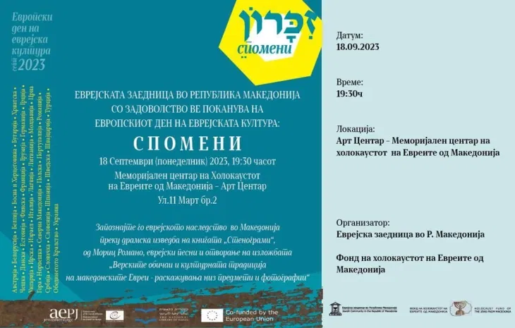 Еврејската заедница во Македонија и оваа година продолжува со традицијата да биде дел од манифестацијата „Европски денови на еврејската култура – Денови на отворени врати“. Оваа година заедно со Фондот на холокаустот на Евреите од Македонија (ФХЕМ) учествуваат со два проекта. Настанот е вечер во 19.30 часот во Арт Центарот на Меморијалниот центар на холокаустот.