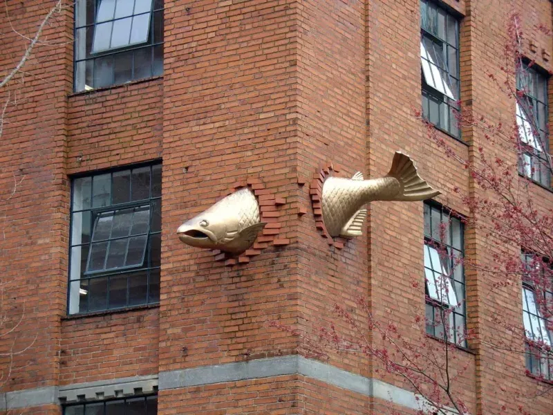 Скулптурата долга 11 метри која уредно се пробива низ ѕид од тули е поставена таму за да ја означи продавницата за морска храна веднаш под неа. Познато е дека Портланд има богати води кои можат да се пофалат со морски животни, па ова е почит на локалниот екосистем што ги храни своите луѓе.