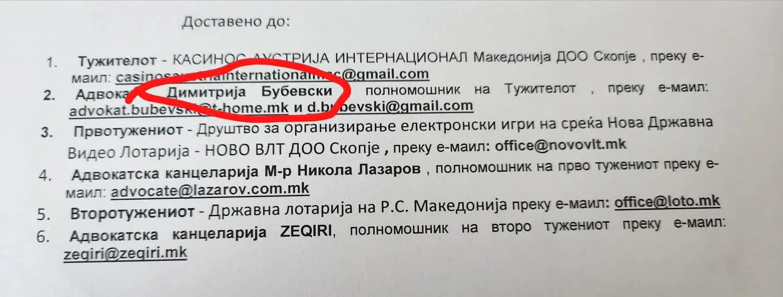 „Канцеларијата Бубевски е правен застапник токму на Касинос Аустрија една од компаниите со монополска позиција во Македонија кога станува збор за игрите на среќа и една од компаниите која ќе биде најпогодена од евентуална либерализација на пазарот на игри на среќа во Македонија. Да не заборавиме дека неодамна од седумте кандидати за судии во Граѓанскиот суд, членовите на Судски совет ја избрааа и Симона Бубевска Муцунски, сопруга на градоначалникот Тимчо Муцунски. Таа е единствената од осумте кандидати кои се избрани. Останатите имиња се свежи, а јавноста досега не ги поврзувала со политиката и политичари. Тоа се Кристијан Митревски, Лилјана Костојчиноска, Драган Петрушевски, Маја Катариниќ, Андреа Апостоловска Малиноска, Машкули Пајтин и Јованов Јордан“, пишува порталот.
