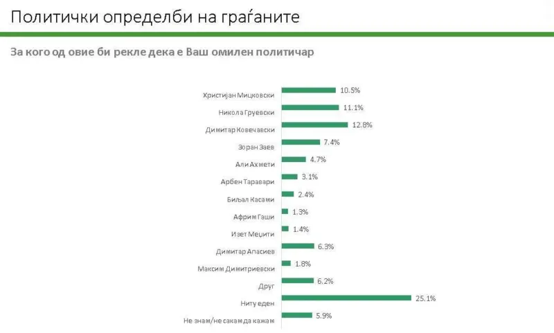 Груевски е омилен кај 11,1 отсто од избирачите, додека Мицкоски има поддршка од 10,5 отсто. Дури и шест години по преземањето на претседателското столче во ВМРО-ДПМНЕ, Мицкоски не успева да го надмине рејтингот на својот претходник.