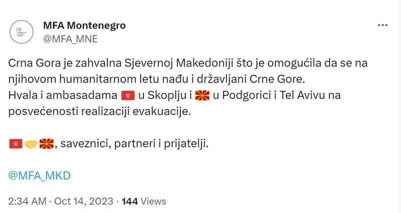 „Црна Гора и е благодарна на Северна Македонија што им овозможи на црногорските државјани да бидат на нивниот хуманитарен лет. Благодарност и до амбасадите на Цена Гора во Скопје и македонските амбасади во Подгорица и Тел Авив за нивната посветеност за реализација на евакуацијата. Северна Македонија и Црна Гора, сојузници, партнери и пријатели“, пишува во објавата на Х од Министерството за надворешни работи на Црна Гора.