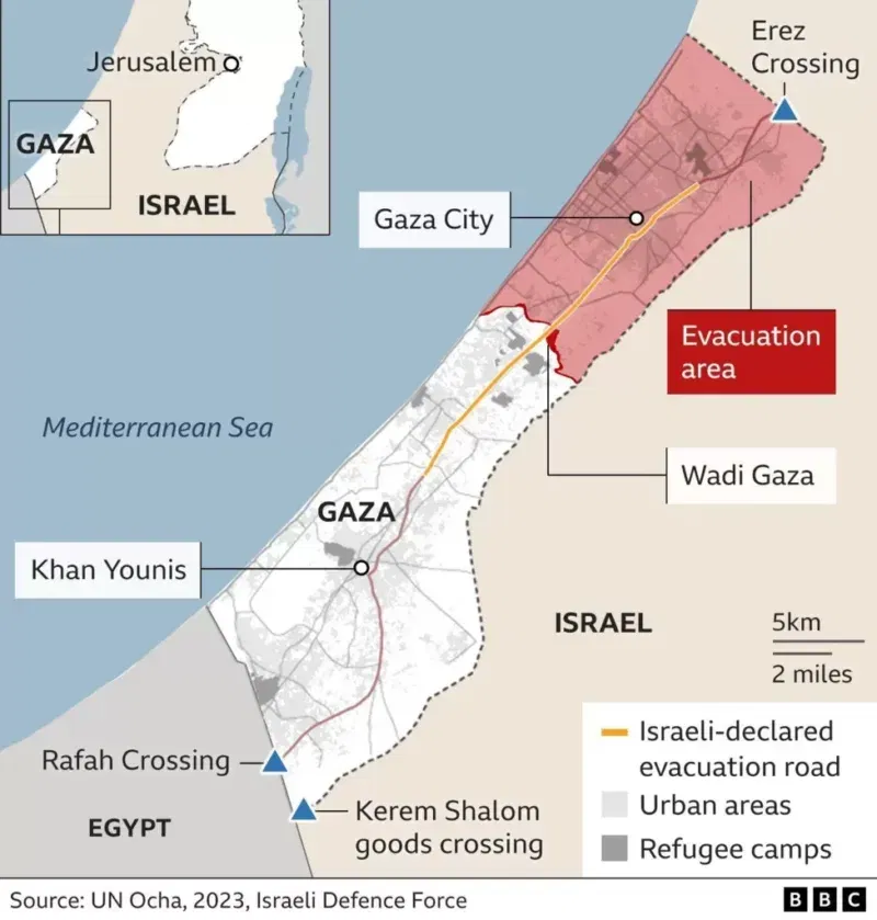 Дописникот на Би-Би-Си, Ружди Абу Алуф, кој се наоѓа во јужниот град Кан Јунис, опиша сцена на „тотален хаос“ на теренот во саботата, со паника меѓу стотиците илјади раселени луѓе кои се засолнети таму, откако Израел им кажал да ги напуштат своите домови на север.