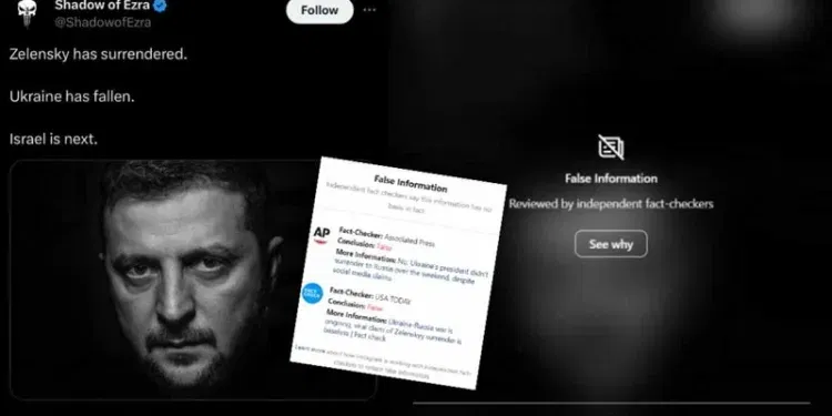 Тврдењата дека Претседателот на Украина се предаде и неговата земја падна во продолжената руска инвазија, кои од саботата беа споделувани на социјалните мрежи, службите за проверка на факти на Асошиетед прес (АП) и USA Today ги оцениja како целосно неточни.