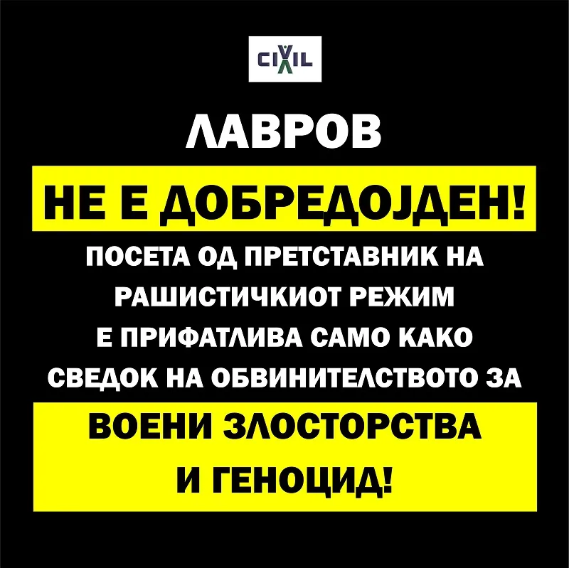„На еден од највисоките функционери на мрачниот режим со седиште во Кремљ, кој води геноцидна војна против соседна држава, независна и суверена Украина, му беше дозволено да дојде во главниот град на Северна Македонија за да учествува на самитот на ОБСЕ. ЦИВИЛ изразува најостар протест против доаѓањето на министерот за надворешни работи на руската федерација, Сергеј Лавров и му порачува дека НЕ Е ДОБРЕДОЈДЕН!