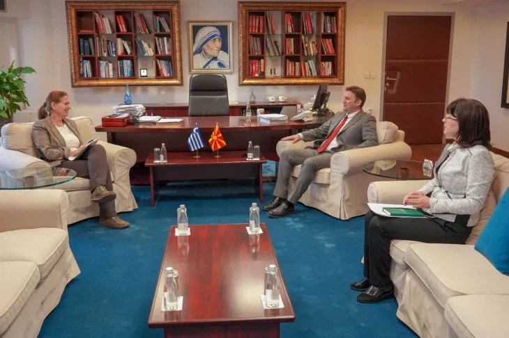 Министерот за надворешни работи, Бујар Османи денеска во својот Кабинет ја прими грчката амбасадорка во земјава, Софија Филипиду. На средбата, како што соопшти МНР, соговорниците изразија задоволство од динамиката со која се развиваат односите меѓу двете соседни земји, соработката во повеќето области и заемната подготвеност за нивно продлабочување.