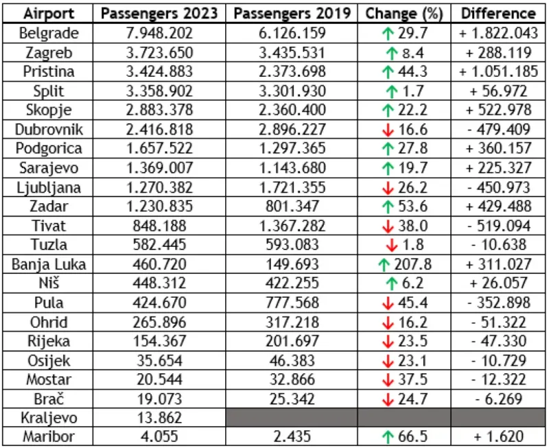 Во однос на пред-ковид периодот (2019 година), белградскиот аеродром бележи 1,8 милиони повеќе патници, приштинскиот еден милион, а скопскиот дополнителни 400 илјади патници.
