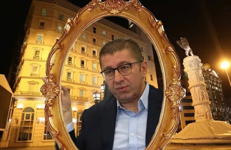 Во својот кабинет во белата палата на вмровците, Мицкоски вежбал самоувереност пред огледало, и… одразот од огледалото побегнал во непознат правец, дознава АХА.