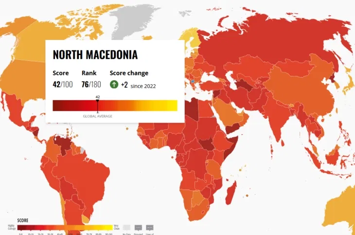 Северна Македонија напредна за два индексни поени и девет позиции на најновата листа на Транспаренси интернешнл, која што го оценува напредокот на земјата во борбата против корупцијата. Според Индексот на перцепција на корупција за 2023 година, Северна Македонија се наоѓа на 76 место со 42 индексни поени, споредно со 2022 година кога беше на 85 место со 40 индексни поени.