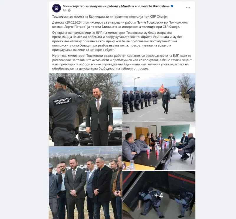 Фотографиите и видео инсертите се направени при посета на техничкиот министер за внатрешни работи Панче Тошковски на Единицата за интервентна полиција, каде што била изведена показна вежба.