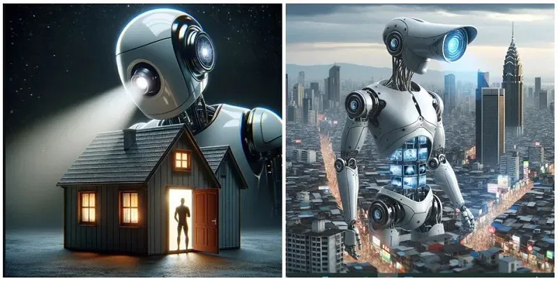Двете илустрации се креирани од ВИ: ДАЛЛ-Е. Првата со промпт даден од авторите на овој фељтон: направи илустрација во која ВИ ги крши човековите права за приватност. Втората со промпт: направи ја истата тема но со повеќе згради – во град
