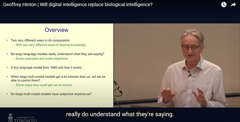 Ако навистина ГВИ е постигната, и притоа таа го има целото досега акумулирано знаење на човештвото, очекувам дека наскоро ќе излезе со решенија за законите на физиката, за универзумот, Биг-Бенгот и слично. Џефри Хинтон (Geoffrey Hinton) eден од најпознатите и највлијателните научници во областа на вештачката интелигенција и машинското учење, особено во развојот на длабокото учење (deep learning), нарекуван и таткото на ВИ, инаку работеше и за Гугл Браин, вели дека ЧЕТ ГПТ 4 разбира што ја прашуваме и разбира што одговара. Во друго интервју вели дека има и интуиција. Тврдењата ги докажува со научни методи (видете на линкот подолу). Ова го тврдеше на предавање со многу илустративен и предупредувачки наслов „Дали дигиталната интелигенција ќе ја замени биолошката интелигенција“.