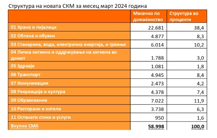 Според Сојузот на синдикати на Македонија, најголемо зголемување има во делот кај храната и пијалоците кои за месец март изнесуваат 22.681,00 денари, споредено со месец февруари, кога изнесувала 21 219,00 денари, зголемени се за 1 462,00 денари. Од ССМ наведуваат дека со изнајмен стан од 60 квадрати за месец март синдикалната кошничка изнесува 74 373,00 денари.