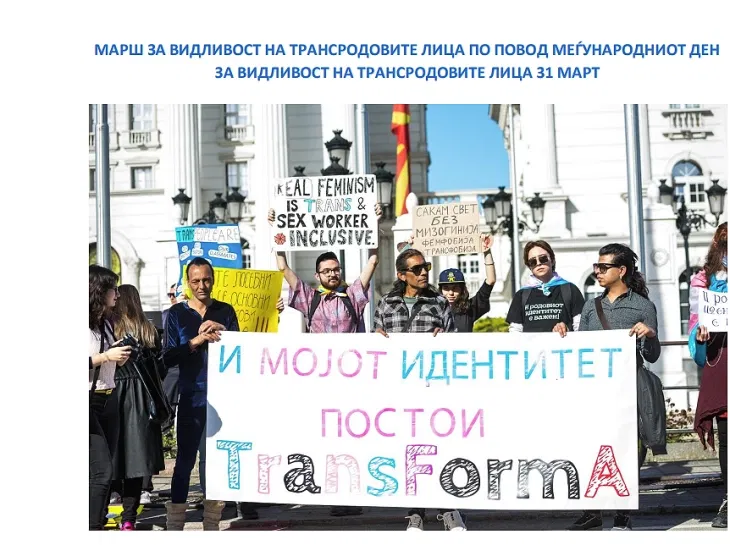 Граѓанската иницијатива за заштита и унапредување на правата на трансродовите лица ТрансФормА, во пресрет на 31 Март – Меѓународниот ден за видливост на трансродовите лица соопшти дека ќе организира марш за видливост на трансродовите лица, што ќе се одржи денеска пред Владата на Република Северна Македонија.