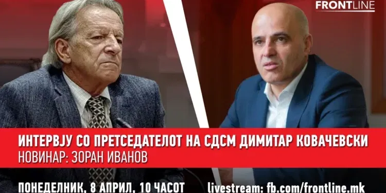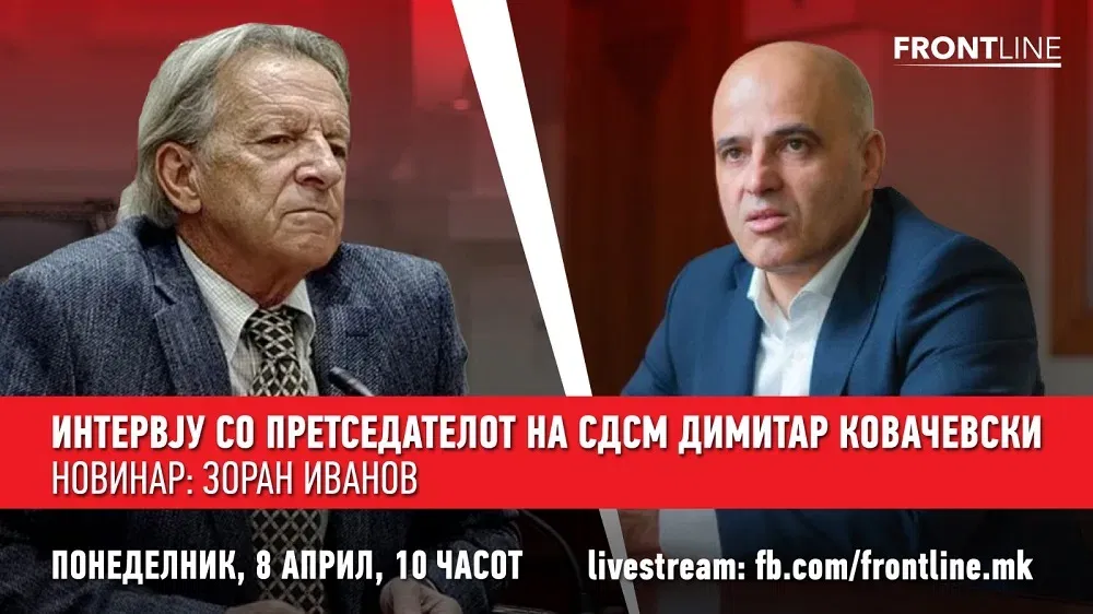 Фронтлајн најавува ексклузивно видео интервју во живо со лидерот на СДСМ, Димитар Ковачевски, денеска, понеделник, 8 април, со почеток во 10 часот. Интервјуто ќе го води познатиот новинар Зоран Иванов, а интервјуто ќе се пренесува на Фејсбук страницата и Јутуб каналот на Фронтлајн.