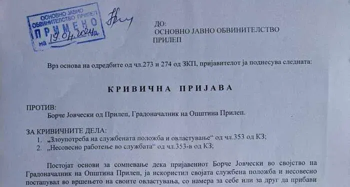 Заради постоење основи за сомневање дека со склучувањето анекс на Договорот за јавна набавка од 27.03.2024 година со фирмата ЕЛЕКТРО – ТОЧИЛА ИНЖЕНЕРИНГ увоз-извоз ДООЕЛ Прилеп, градоначалникот на Општина Прилеп Борче Јовчески направил повреда на законските одредби од Законот за јавни набавки, Општинската организација на СДСМ Прилеп против Јовчески поднесе кривична пријава за сторени кривични дела „Злоупотреба на службената положба и овластување“ и „Несовесно работење во службата“, истакна на прес-конференција Моника Грашеска Илиеска, координатор на советничката група на СДСМ и Коалицијата во Советот на Општина Прилеп.