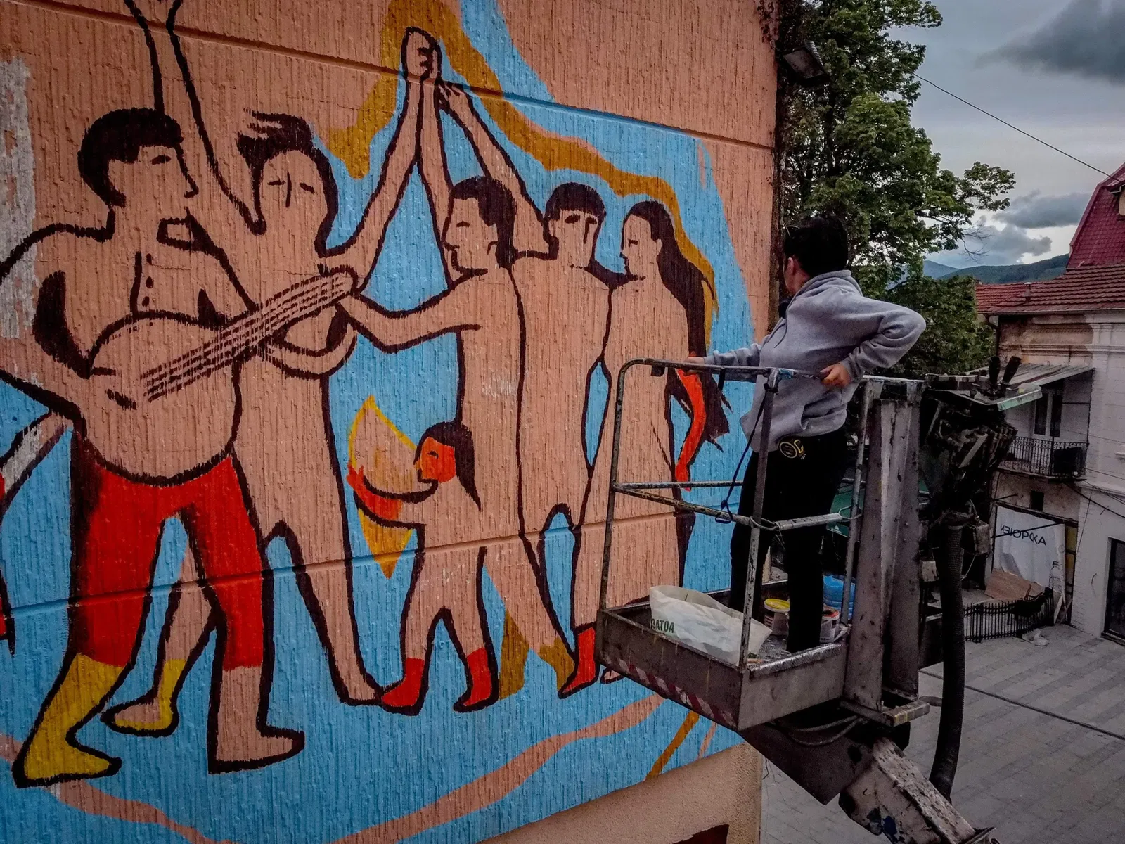 Во соработка со ФРУ – Скопје, идејата за овој мурал е делумно инспирирана од релјефот на Јордан Грабулоски, македонски академски вајар и уметник, кој го има изработено на спомен-костурницата во Кичево. Од истиот тој релјеф, композициски се презема инспирацијата да се преобрази во еден поинаков контекст преку кој се нагласува хармонична соработка помеѓу луѓето (во сооднос со самата порака) но и ја доловува функцијата на домот на култура – како простор каде што се негува културата и уметноста иницирана од индивидуалци и групи.