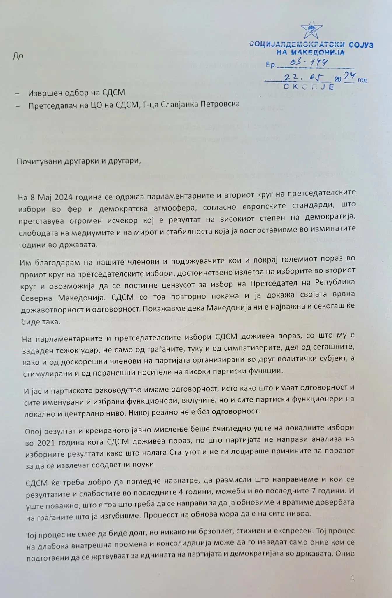 Согласно член 68б став 3, а врз основа на изборните резултати на парламентарните и претседателските избори 2024 година, како и врз основа на очигледната пасивност на дел од членовите и симпатизерите на СДСМ, вклучително и најголемиот дел на избраните и именуваните функционери на централно и локално ниво, како високо морален чин се повлекувам од функцијата Претседател на СДСМ .