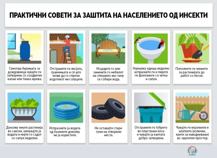 – Правилно отстранете го отпадот и покријте ги контејнерите или кантите откако сте го отстраниле отпадот. Одржувајте ги септичките јами и одводните канали околу вашата куќа или зграда. Елиминирајте ја стоечката – стагнантната вода во олуците за дожд, сливници, стари гуми, кофи, пластични капаци, играчки или кој било друг сад каде може да се размножуваат комарците. Еднаш неделно, а пожелно е и почесто испразнување или менување на водата од кафезите за птици, фонтаните, базените, бурињата за дожд и саксии за да ги уништите потенцијалните живеалишта на комарците. Отстранете ги старите гуми, искористените пластични шишиња, лименки и слично. Прекријте со мрежа или затворете ги сите садови што служат за складирање вода, велат од ИЈЗ.