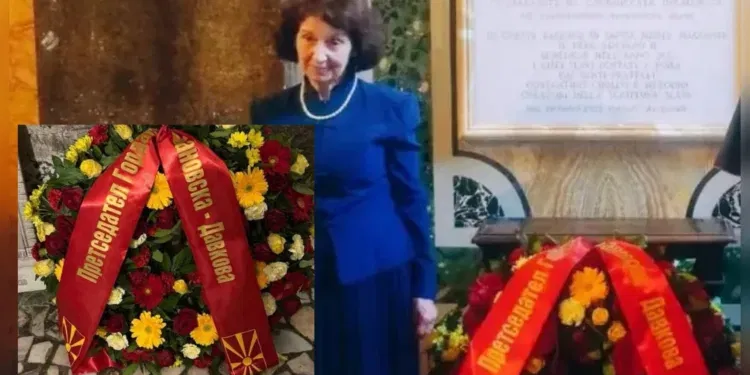 Граѓаните во коментари на социјалните мрежи прашуваат – Во чие име претседателката Силјановска Давкова положи венец ако на лентата го нема името на државата на која е претседателка?